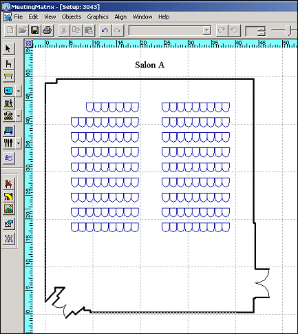 If a MeetingMatrix layout drawing has not yet been created for this event, a fresh copy of the template for the selected function space appears. The function space will be shown with seating arranged in the setup style you selected for the event, or with the setup style that is the default for this function space. In addition, if you specified resource items to be a part of the setup style (this is done when you configure the seating style with the MeetingMatrix Seating Wizard), those resource items will automatically appear in your layout.