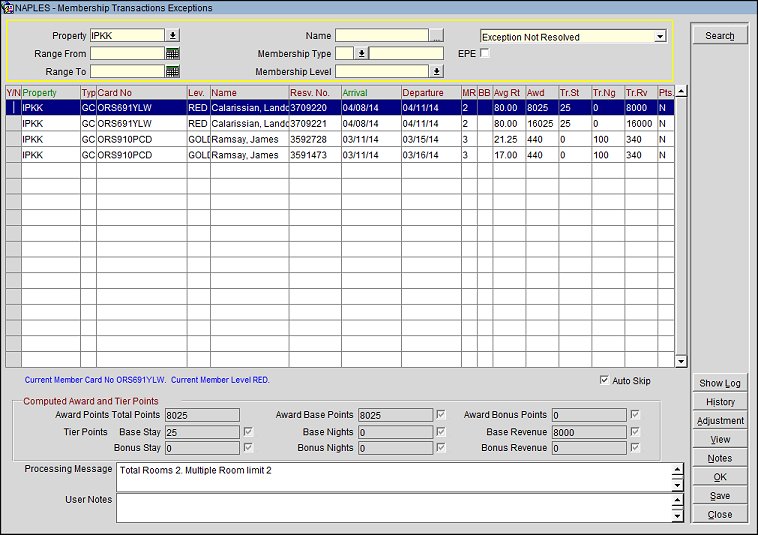 When the ORS/OCIS system is configured for Membership Exceptions, users can view stay records and choose whether or not they want to issue award points to guests when membership transaction exceptions occur. Membership transaction exceptions occur when a guest has multiple room stays for the same time period, or back to back stays at a single property or multiple properties. When configured, these exceptions are flagged and viewed on the Membership Transactions Exceptions screen. Instead of award/tier points being automatically granted, users can view the exceptions on the screen and manually select the appropriate transaction for award/tier points and designate the transaction as Accepted or Not Accepted as valid points. Users can also make adjustments to the award/tier points. (Transactions where Stay UDFs were sent from V6 in the FF_ELIGIBLE and FG_ELIGIBLE fields, making the guest's transaction ineligible for points, cannot be adjusted.)