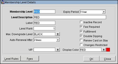 Level Rules. Available when this membership type is selected as Primary on the Membership Types screen (available with ORS/OCIS and Points Managed Central only). Select this button to create rules about how membership tier points are used to upgrade or downgrade a guest's membership to a higher or lower level, respectively. See Membership Level Rules.