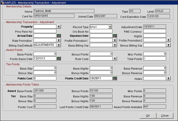 Points Cost. Enter an actual or estimated total cost to the property associated with the adjustment points credited to the member. This information can be used to track the expenses associated with the membership program.