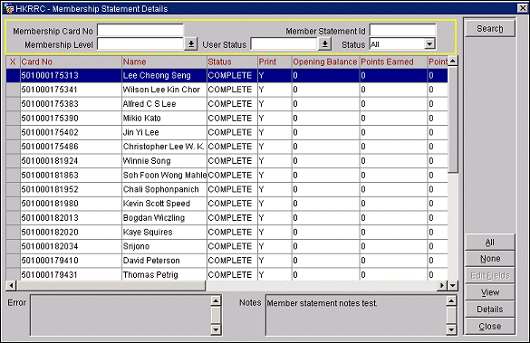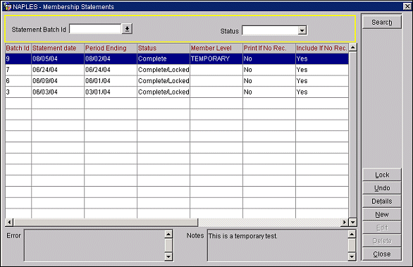 Details. (Visible when a batch status is Complete/Locked, Complete, or New.) Select this button to view the Membership Statement Details screen. At this screen you can view the individual member details that are part of the statement batch.