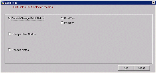 Edit Fields. Select this button when you want to change certain parameters in the batch statement, such as Print Status, User Status, and Notes. The Edit Fields screen appears.