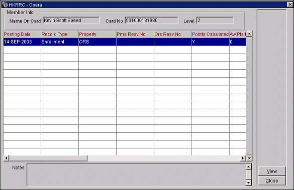 Access the Member Stay Details screen by selecting the Details button on the Membership Statement Details screen. This screen lists the details related to the member's awards points and stay.