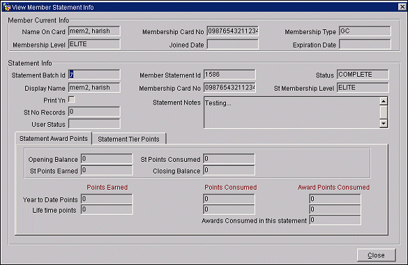 For management purposes, membership statements serve as an effective tool that enables users to evaluate how well members are taking advantage of the benefits offered them. Membership statements are typically run at a scheduled time, processed, and sent to a publishing house or fulfillment center for printing and mailing to members. Members receive the membership statements and review their award points earned and consumed for a specific time period.
