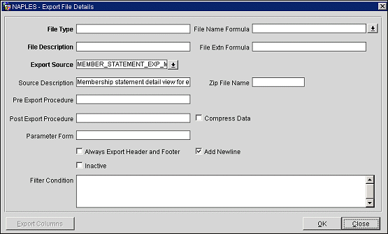 Export Source. Select the down arrow to display a list of the available views for the export procedure. The two provided choices for exporting membership statements are: