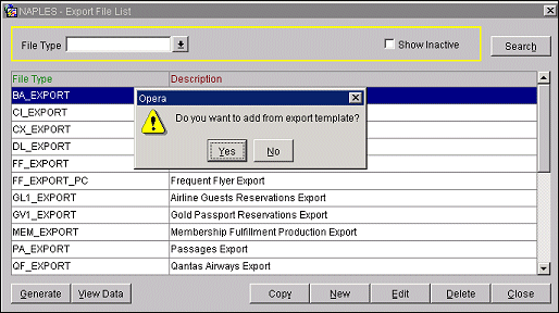 At the Export File screen, select the New button. A prompt appears asking you if you want to add from the export template. Select the No button, as you are going to set up your own export details in the following steps.