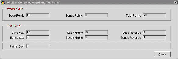 Rules are set up to calculate award points, tier points, or both. Following are the details if this transaction is associated with award points. Award points are not directly based on stays, nights, or revenue.