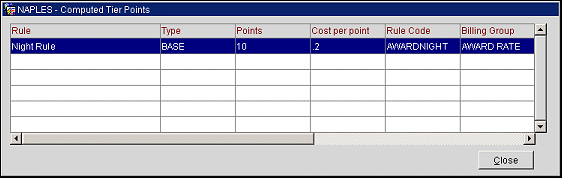 Award Points. Display the Points Accrued screen for the current points transaction. This screen shows the validated rule used to generate tier points, the type of points, number of points, cost per point, rule code for the award points, billing group the points belong to, award bucket qty., tier bucket qty., award points, tier points, rule group, and qualified revenue. The Qualified Revenue column in the table shows the total qualifying revenue in central currency for the membership points transaction.