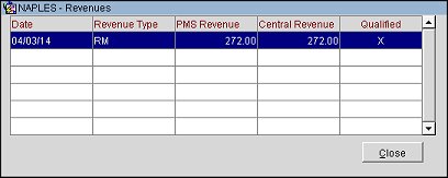 View Revenues. Display the Revenues screen for the stay associated with the current points transaction. This screen shows the date the revenue was recognized, the revenue type (PMS revenue buckets are seen as revenue types in ORS), PMS revenue and central revenue. An "X" under the Qualified column indicates if a stay qualified for points credit.