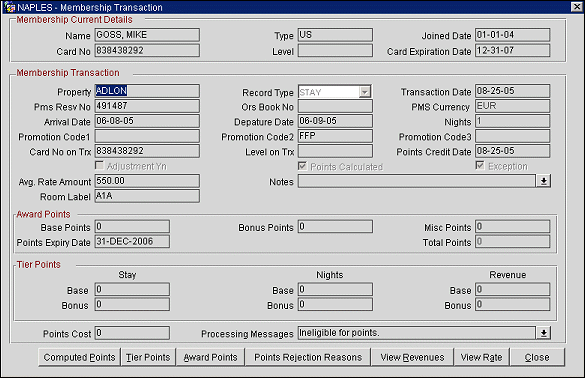 Exception. This check box is selected if the Membership Parameter>Membership Exception is enabled and the transaction was flagged as an exception. (Exceptions occur when a guest has multiple room stays or back to back stays at a single or multiple properties. Exceptions also occur when Stay UDFs were sent from V6 which populated the FG_ELIGIBLE (Frequent Guest Points) and FF_ELIGIBLE (Frequent Flyer Points) columns on the OCIS membership transaction. The transaction is designated with the Exception type of "Ineligible for Points" and no points will be awarded. The UDF values in PMS V6 can be any user-defined value. On the Membership Transaction screen, the system will automatically check the Exceptions check box and include a note in the Processing Messages "Ineligible for points.")