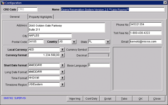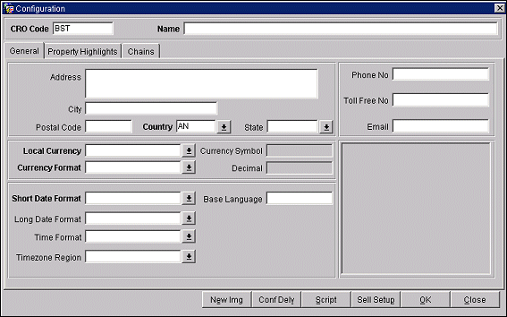 This tab allows you to define the central reservation office locations. Their demographics and specifics such as time and date formats can be entered. See Configuration - General Tab for more information.