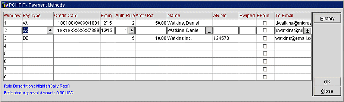 The Payment Methods screen is used to set up more than one method of payment for a reservation. When the Reservations > Payment Types Per Window application function is set to Y, up to eight different payment methods can be set up for a reservation from the Reservations, Payment Method, Routing Instructions, and Group Rooming List screens. For example, a guest has a reservation that was made by a travel agent through the corporation that the guest works for. The corporate credit card is paying for the room and tax cost and the guest will be paying for all the incidental charges with their own credit card. With this type of reservation, each credit card will be linked to its own folio window. By linking each payment method to a folio window for the reservation, this task can be completed.