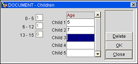 Note: If the Rates>Rates By Defined Buckets application function is set to Y, and child age buckets have been set up using the Rates>Min Age Rate Bucket and Max Age Rate Bucket application settings, an ellipsis button appears next to the Child field. Select this button to view or edit the number of children in each age group (e.g., 1-12 Years, 13-15 Years, 16-18 Years). Enter the age of the first child in the Child 1 Age field, enter the age of the second child in the Child 2 Age field, and so on. When you are done, select the OK button and the number of children in each age group will appear in the fields to the left.