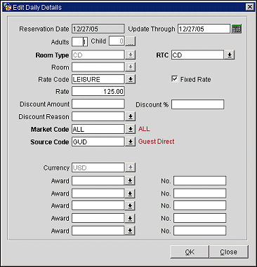 For a reservation from 12/23/09 to 12/28/09, the nights of 12/23 - 12/25 have been assigned a RACK rate code and the nights of 12/26 - 12/27 have been assigned a rate code of DLX. If the 12/25 date of the reservation selected on the Daily Details form and the Edit button is selected, then the details attached to that day of the reservation will be populated into the Edit Daily Details form, including the RACK Rate Code. If the user selects to update the daily details through 12/27 and selects to change the Rate Code to SPECIAL, then only the Rate Code is updated for the 12/25 date as this is the only date in the dates selected to be updated that had an original Rate Code of RACK. The reservation dates of 12/26 and 12/27 would not be updated because they had an original Rate Code of DLX.