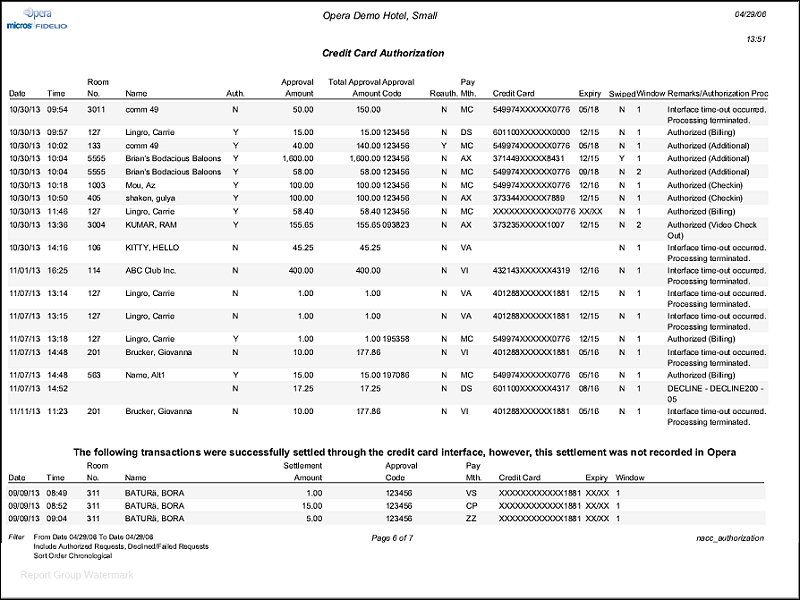 Miscellaneous>Reports>nacc_authorization - This report will list all the authorizations of all types, failed / successful / declined each and every one for the given date range and based on selection criteria. This will include authorizations performed from any of the available option in Opera such as manual, additional, Batch, Automatic, Check in, Night Audit etc.