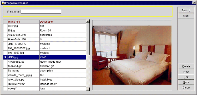 If an image has already been attached to the room type or room, it is displayed in this screen. The Detach button is available only if an image is already attached. Select Detach to un-associate the image from the room or room type. Select the Attach button on the Image screen to select the image you want to associate with the room type or room. The Image Maintenance screen appears.