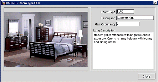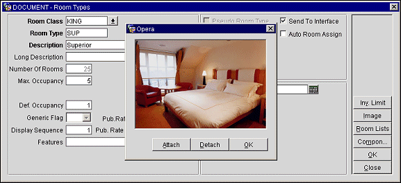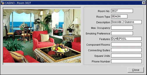 Once they have been configured, room type and room images are accessible from various places in OPERA. Pictures of rooms and room types may be displayed from the Available Room Search screen, Room Assignment screen, the Housekeeping Room Discrepancy screen, the Room Plan screen, the Floor Plan screen, the Rate Query screen and the Function Diary (when the OPS<version_number> Sales & Catering license is active). Along with the pictures are details about the room or room type.