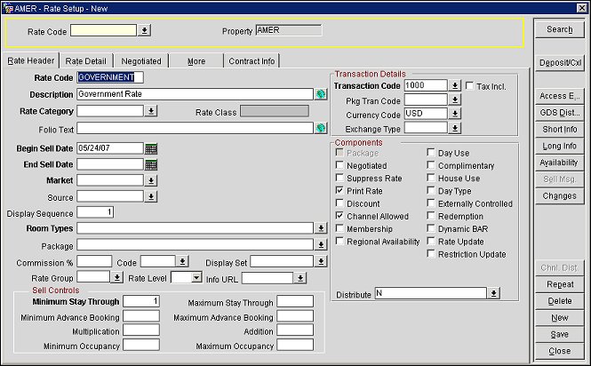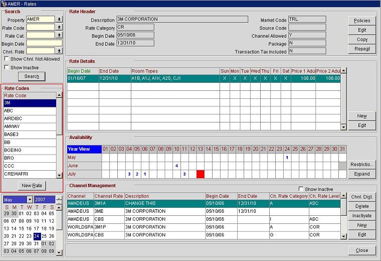 The Rate Codes area displays the rate codes available based on the search criteria entered by the user. Place your cursor on a rate code to configure with that rate codes. The information displayed in the Rate Header, Rate Details, Availability, and Channel Management areas change based on the rate code selected in the grid.