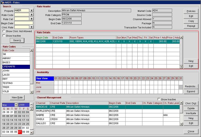 The Rate Details area displays detailed rate code information, including the begin and end dates, the room types, valid days, and prices.