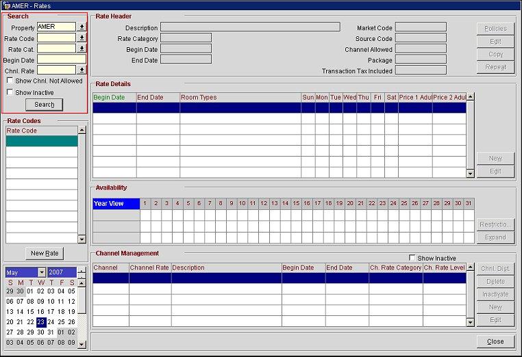 The Search area of the Rates screen allows users to enter search criteria and narrow their results.