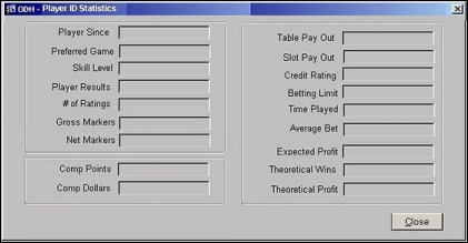 The player statistics form displays up to 30 configurable player details and one Note field sent from the PTS. The PTS determines the labels and data values to be displayed within the message. This form is informational only and has no OPERA interaction other than displaying the data.