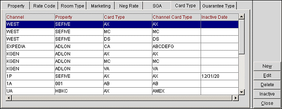 Select the New button to add new card types, or the Edit button to edit existing card types. Select the Delete button to delete an existing card type configuration. Select the Inactive button to inactivate a card type.