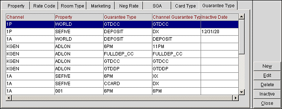 Select the New button to add new guarantee types, or the Edit button to edit existing card types. Select the Delete button to delete an existing guarantee type configuration. Select the Inactive button to inactivate a guarantee type.