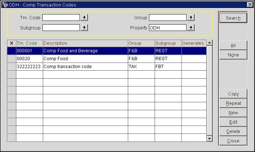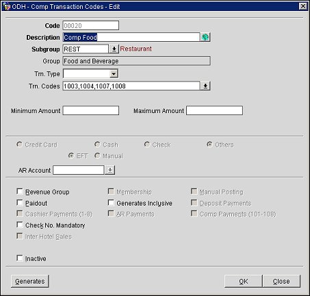 Note: Depending on the style of operation, you may not wish to associate any generates with comp transaction codes. It is often the property's reasoning that if you comp a charge, you also wish to absorb associated costs such as taxes and service charges.