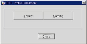 To access the Gaming Enrollment screen, highlight the guest's name on the Profile Search screen (Reservations>Profiles) and select the Enrollment button. Or, select the Enrollment button from the Profile Options menu (select the Options button from the guest Profile screen) or from the Profile Membership List screen (available when you select the Memberships button from the Profile Options menu). You may also access enrollment when creating a new reservation. From the New Reservation screen (which appears when you select Reservations>New Reservation, enter all or part of the guest's name. Select the Search button to display the Profile Search screen, from which you may select the Enroll button. The Profile Enrollment screen appears.