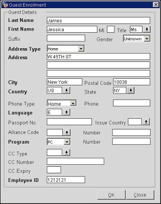 Provide the following information, and then select the OK button to submit the enrollment to the guest loyalty program central database.