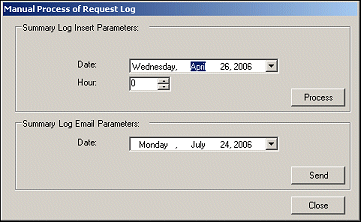 To process all of the requests for a particular hour of the day, select the date in the Date field and the hour in the Hour field in the Summary Log Insert Parameters area, then select the Process button. To send a summary of the requests to the email address specified in the configuration settings, enter the date in the Date field of the Summary Log Email Parameters area, then select the Send button.