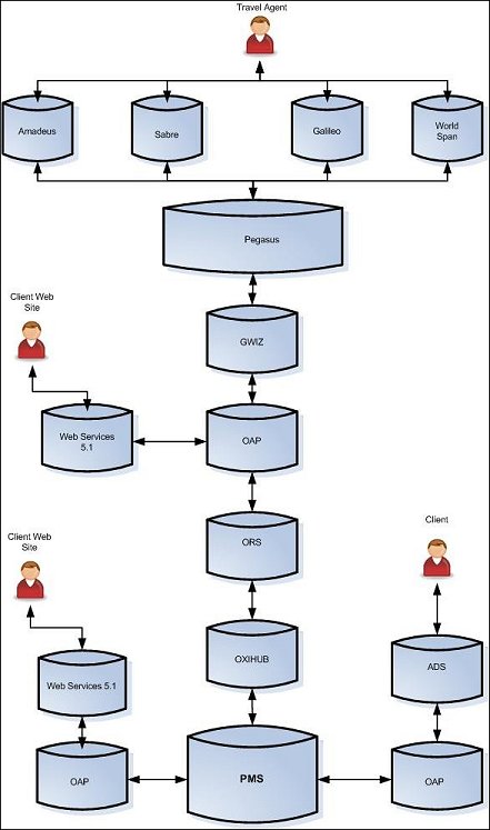 The following diagram shows how GDS/ADS and Opera communicate through GWIZ. The top portion of the diagram shows the GDS and ADS hosts that need to be configured in Opera as channels (Sabre, Apollo, Orbitz, etc).