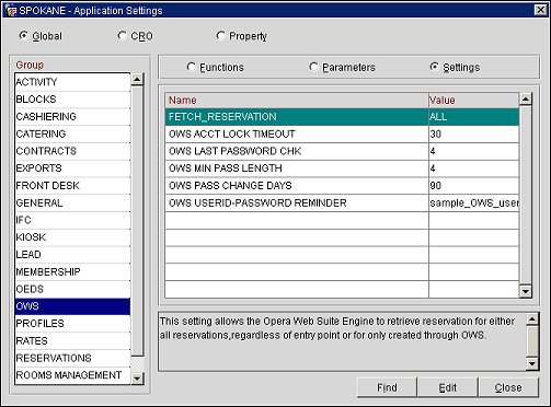 FETCH RESERVATION - This setting allows the Opera Web Suite engine to retrieve reservation for either all reservations, regardless of entry point or for only created through OWS. The available values are ALL and WEB. At the property level, when the application setting is set to ALL, Opera will search reservations. When the setting is defined as WEB, Opera will search reservations for which the channel type is WEB.