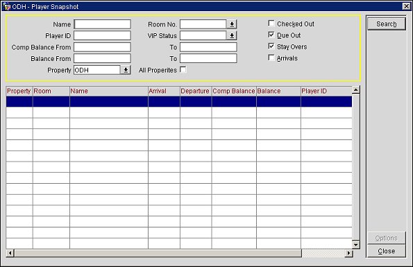 Besides providing an overview of information related to guests who have player IDs, the Options menu available from the Player Snapshot screen gives you direct access to additional profile, reservation, billing, and transaction routing details related to the guest stay. From the Player Snapshot screen you can, for example, determine which guests are scheduled to arrive on a given date; then you can go directly to the guest Routing screens to set up comp routing prior to their arrival. You can also use this screen as a starting point to modify reservation information for a guest (such as departure date or room assignment). The screen lets you easily check the current comp balances for in-house guests.