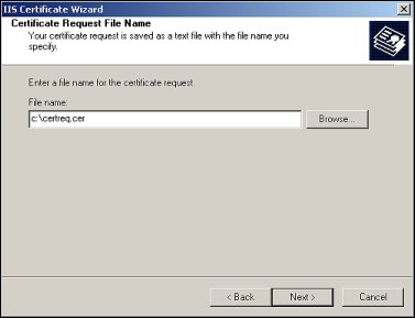 11. The Certificate Request File Name dialog box appears. Enter the path and name for the certificate request in the File Name field and then select the Next > button.