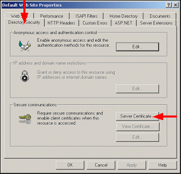 3. When the Default Web Site Properties dialog box appears, select the Directory Security tab, then select the Server Certificate button.