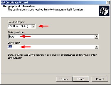 10. The Geographic Information dialog box appears. Complete the Country/Region, State/Province, and City/Locality fields and select the Next > button.