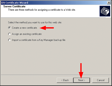 5. When the ISS Certificate - Server Certificate dialog box appears, select Create a new certificate, and then select the Next > button.