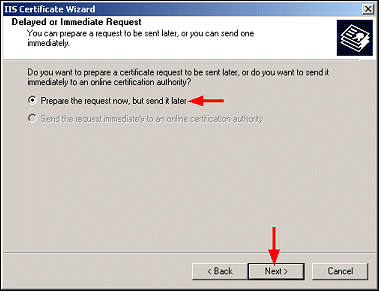 6. When the ISS Certificate Wizard - Delayed or Immediate Request dialog box appears, select the Prepare the request now, but send later radio button, and then select the Next > button.