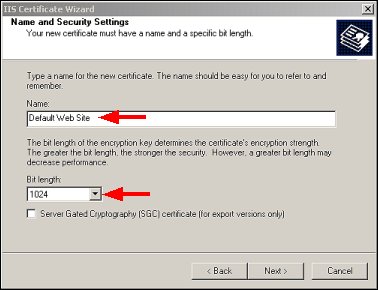 7. The Name and Security dialog box appears. Enter the certificate name in the Name field. You can give the certificate any name you wish, however it is probably best to give it the same name as your Web site. Select 1024 in the Bit length field, and then select the Next > button.