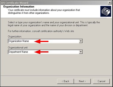 8. The Organization Information dialog box appears. Enter the organization name in the Organization field, and enter the department that the certificate will belong to in the Organization Unit field. Select the Next > button to continue.