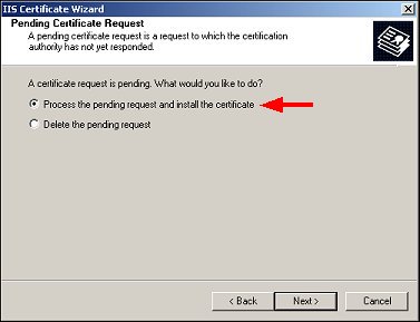 5. The Pending Certificate Request dialog box appears. Select the Process the pending request and install the certificate radio button, and then select the Next > button.