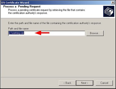 6. The Process a Pending Request dialog box appears. Enter the path to your certificate or browse to it using the Browse button, and then select the Next > button.