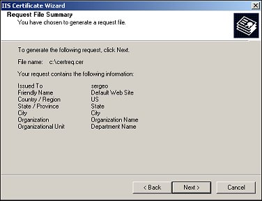 12. The IIS Certificate Wizard displays a summary of the values you entered. If you find any mistakes, select the < Back button and correct them. If everything looks OK, select the Next > button.