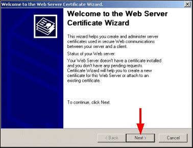 4. When the Web Server Certificate Wizard dialog box appears, select the Next > button.