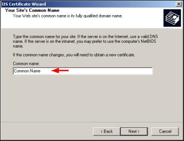 9. The Your Site's Common Web Site Name dialog box appears. Enter the Web Site name in the Common Name field. The common name is the Web site address the certificate will cover. For example, this could be www.yourcompany.com or secure.yourcompany.com. You will need a valid DNS name if you plan on accessing your secure site through the Internet. When you have finished, select the Next > button.