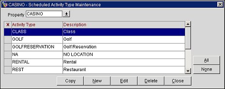 Use this screen to add new activity types for scheduled activities and to copy activity types to other properties (if the OPP_MHOT Multi-property PMS add-on license is active).