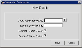 To configure the Activity Type (EAS) conversion code, highlight the conversion code in the Conversion Code column and select the New button. The Conversion Code Value screen appears.
