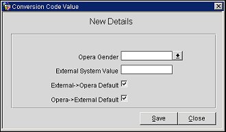 To configure the Gender conversion code, highlight the conversion code in the Conversion Code column and select the New button. The Conversion Code Value screen appears.