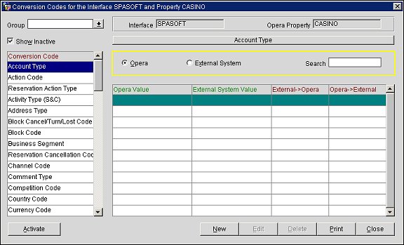 The Conversion Codes for Interface XXX and Property YYY screen allows a user to activate the conversion tables that should be used for a specific interface. To access this screen, login to OXI, select the "SpaSoft" interface at the Opera Login prompt, and then select Interface Configuration>Conversion Codes. The Conversion Codes for Interface XXX and Property XXX screen appears.